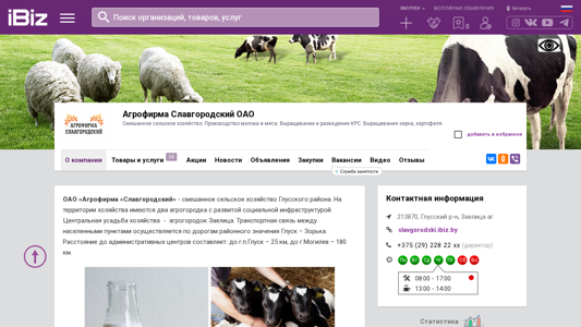 | AI-анализ | This website belongs to OAO Agrofirm Slavgorodsky, a mixed agricultural business based in the village of Zaelevitsa, Guskovsky District, Belarus. The company specializes in the production of dairy and meat, as well as the cultivation and breeding of livestock, and the farming of grains and potatoes. The central farmstead is located in the agro-town of Zaelevitsa, and is accessible via local roads. The nearest administrative centers are Guskov (25 km) and Mogilev (180 km). Agrofirm Slavgorodsky grows and sells grains, rapeseed, potatoes, and dairy products derived from its cattle herd. The farm includes facilities for raising young livestock, dairy farms, arable land brigades, and support services such as a repair shop, |