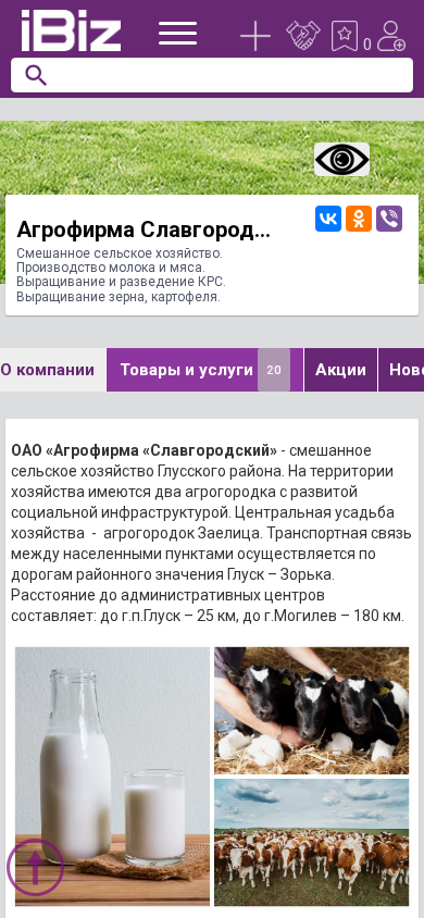 | Название / Заголовок | Агрофирма Славгородский ОАО - Смешанное сельское хозяйство. Производство молока и мяса. Выращивание и разведение КРС. Выращивание зерна, картофеля.. 213870, , Заелица аг. |