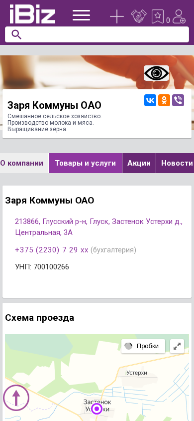 | Название / Заголовок | Заря Коммуны ОАО - Смешанное сельское хозяйство. Производство молока и мяса. Выращивание зерна.. 213866, Глуск, , Застенок Устерхи д., Центральная, 3А |