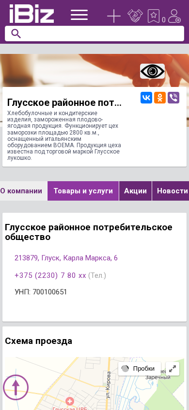 | Название / Заголовок | Глусское районное потребительское общество - Хлебобулочные и кондитерские изделия, замороженная плодово-ягодная продукция. Функционирует цех заморозки площадью 2800 кв.м., оснащенный итальянским оборудованием BOEMA. Продукция цеха известна под торговой маркой Глусское лукошко.. 213879, Глуск, , Карла Маркса, 6 |