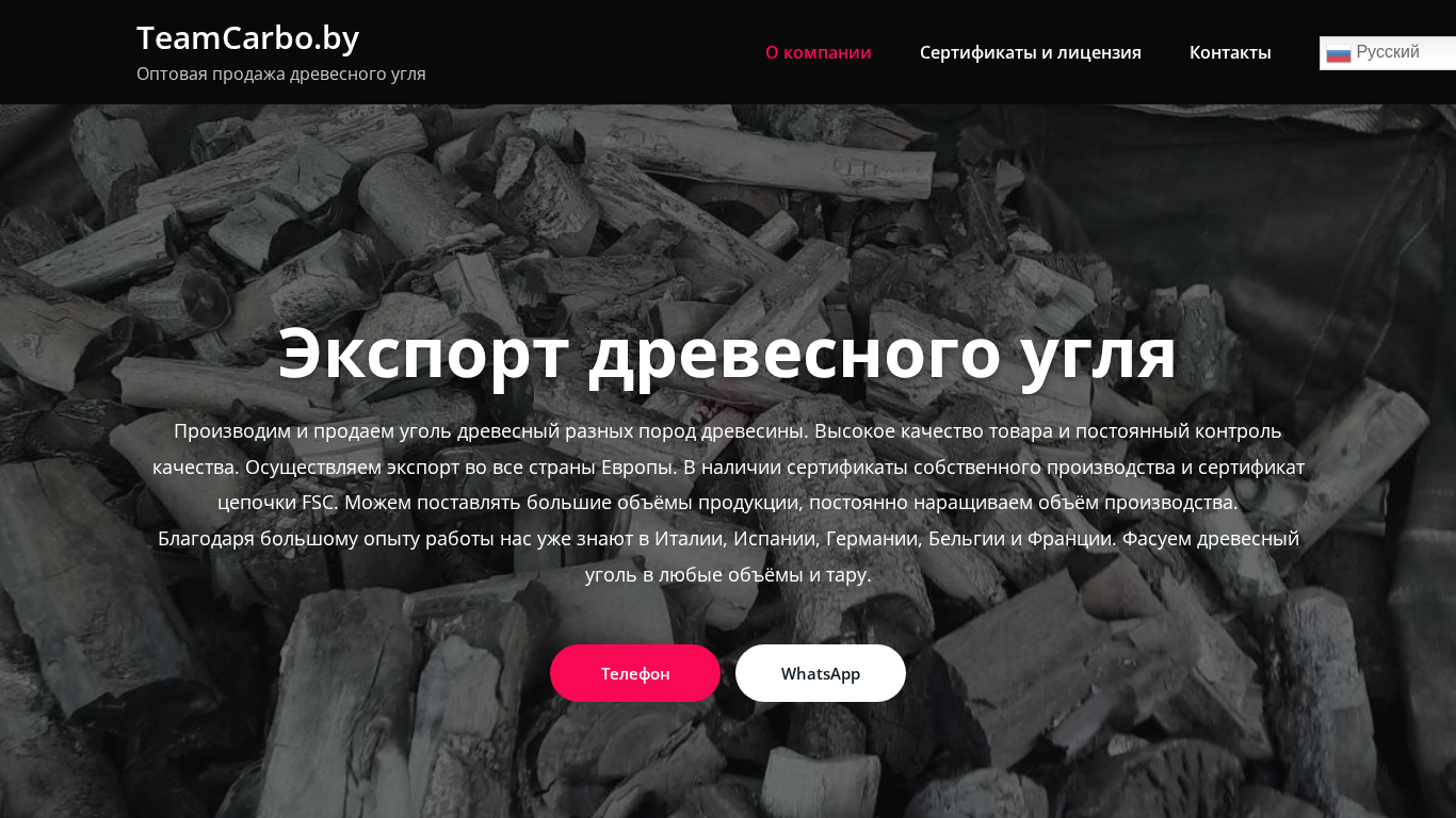 | AI-анализ | The web project TeamCarbo.by is the homepage of a Belarusian company specializing in the opto-wholesale trade of wood coal. The title of the page is "Главная" (Main), and the description mentions the company name "TeamCarbo" six times. Keywords related to the business include "угля" (coal), "древесного" (wood), "производство" (production), "продажа" (sale), and "контакты" (contacts). The top words indicate that the company is located in Belarus, and the language options suggest that the website is available in Russian, Czech, Dutch, English, Estonian, French, German, Italian, Portuguese, Russian, Spanish, and Belarusian. The unified postal identifier (UPIN) 7912560 |