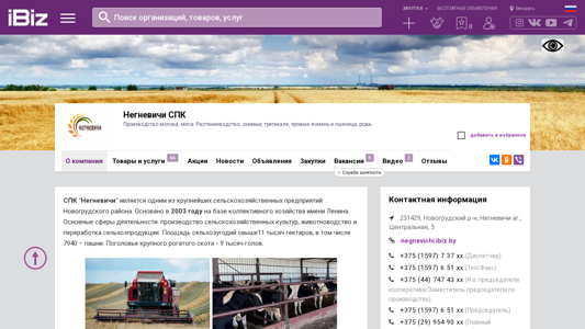 | AI-анализ | --- The website "negnevichi.ibiz.by" is dedicated to Negnevichi Agricultural Enterprise, a large-scale agricultural company based in Belarus. The main areas of business include crop production, livestock farming, and the processing of agricultural products. The company's farmland covers over 11,000 hectares, with 7,940 hectares used for cultivation. The herd size for livestock is approximately 9,000 heads. Negnevichi Agricultural Enterprise consistently achieves high yields in grain harvesting and hay production. Employees of the enterprise are often recognized as the best workers in Novogrudok district. The company offers a range of agricultural products including grains, oilseeds, sugar beets, milk, and meat from livestock. The website provides information about the company, its products and services |