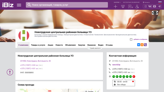 | AI-анализ | The web project "Новогрудская центральная районная больница УЗ - Больницы" offers various medical services including emergency medical care, laboratory diagnostics, dental care, gynecology, ophthalmology, functional diagnostics, and instrumental diagnostics. The contact details and address of the company are provided: 231400, Новогрудок, Волчецкого, 53. The website is listed under the categories "Больницы, госпитали" in the Yandex Business Directory. |