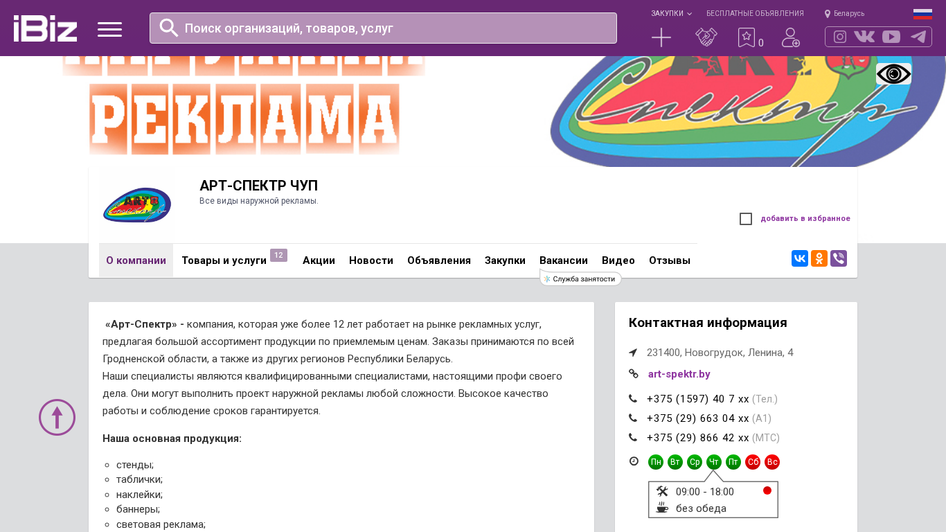 | Название / Заголовок | АРТ-СПЕКТР ЧУП - Все виды наружной рекламы.. 231400, Новогрудок, Ленина, 4 |