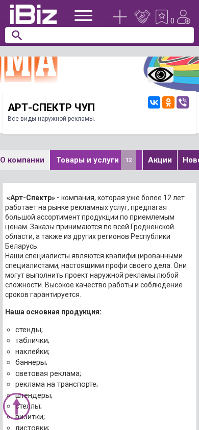| AI-анализ | This website is for the Belarusian company "АРТ-СПЕКТР ЧУП" located at Ленина, 4, 231400, Новогruдоk, offering various types of outdoor advertising services. The company's address, contact telephone numbers, and scheme of arrival are provided. The website includes sections for company information, products and services, announcements, and vacancies. The main offerings include advertising services, graphic services, and printing services, such as stands, tablets, stickers, banners, lighting advertisements, transportation advertisements, stands, poles, business cards, leaflets, flyers, brochures, and more. A free design project is included with every order. The company has been operating for over 12 years in the advertising market, serving the Grodno region and other areas of Belarus. Their |