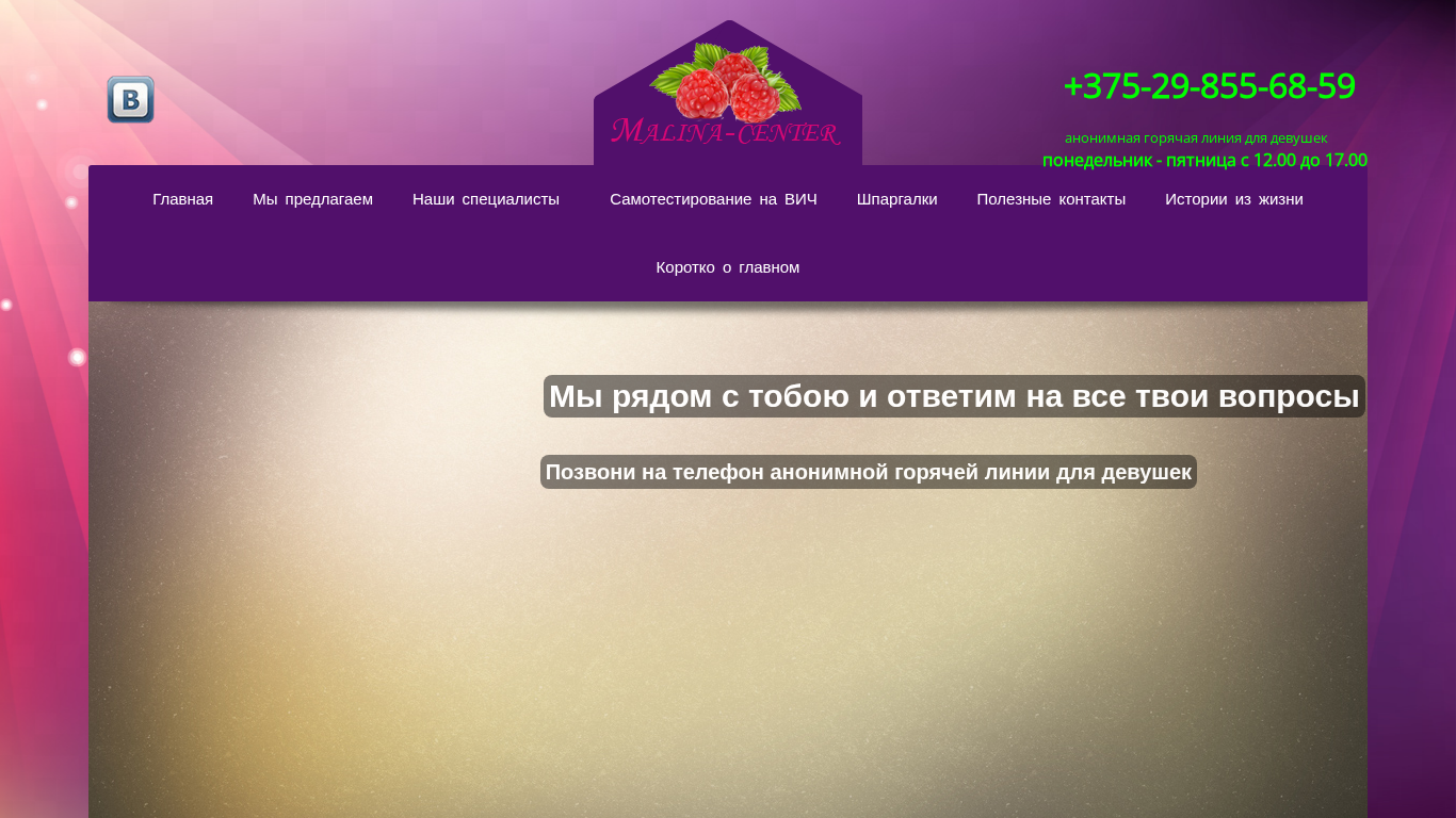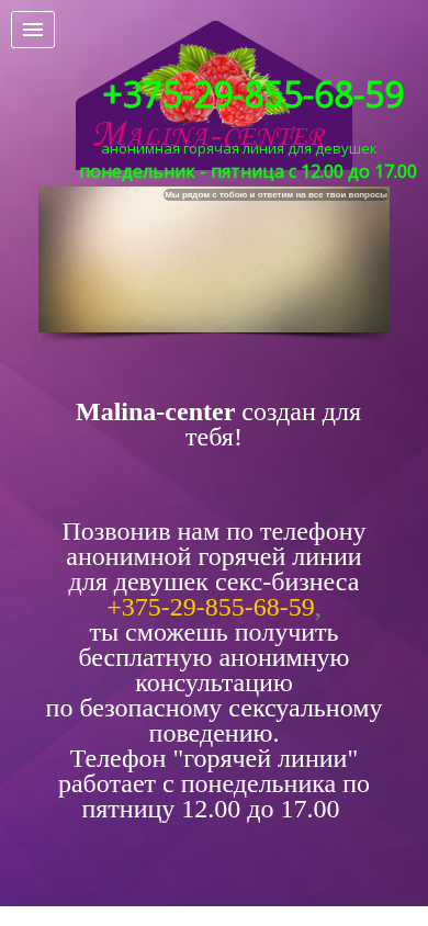 | AI-анализ | --- The portal malina-center.by is a professional consulting service for women. It offers anonymous phone lines for women from Monday to Friday, from 12:00 to 17:00. The website provides information on legal, dermatovenereological, and self-testing issues related to HIV. It also features useful contacts and stories about real-life situations. The main focus is on answering women's questions and helping them find solutions to complex situations. The website offers a team of specialists including lawyers, dermatovenereologists, and sexologists. Malina-Center.by aims to be a place where women can always find a listening ear and receive help. The website also mentions that they work in 12 cities in Belarus and have anonymous consultation rooms. Due to the unfavorable epidemiological situation in the world regarding the novel coronavirus 2019-n |