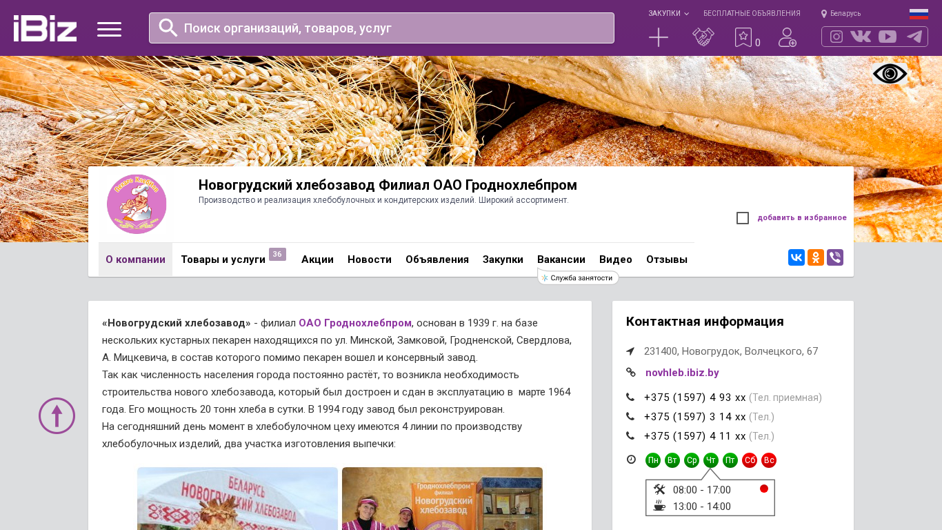 | Название / Заголовок | Новогрудский хлебозавод Филиал ОАО Гроднохлебпром - Производство и реализация хлебобулочных и кондитерских изделий. Широкий ассортимент.. 231400, Новогрудок, , Волчецкого, 67 |