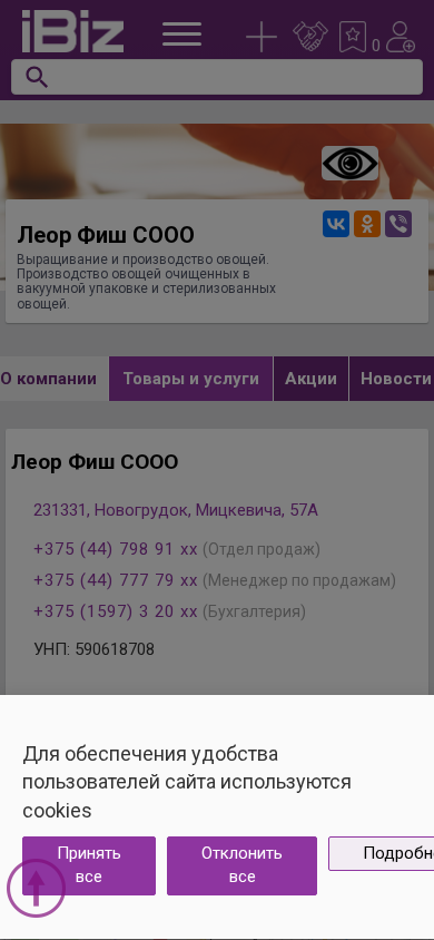 | Название / Заголовок | Леор Фиш СООО - Выращивание и производство овощей. Производство овощей очищенных в вакуумной упаковке и стерилизованных овощей.. 231331, Новогрудок, , Мицкевича, 57А |