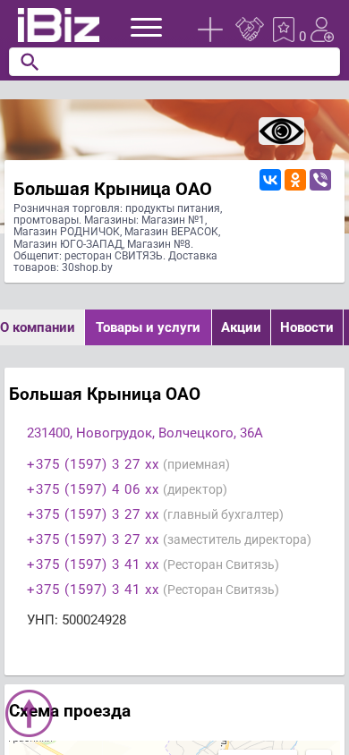 | Название / Заголовок | Большая Крыница ОАО - Розничная торговля: продукты питания, промтовары. Магазины: Магазин №1, Магазин РОДНИЧОК, Магазин ВЕРАСОК, Магазин ЮГО-ЗАПАД, Магазин №8. Общепит: ресторан СВИТЯЗЬ. Доставка товаров: 30shop.by. 231400, Новогрудок, , Волчецкого, 36А |