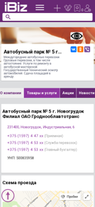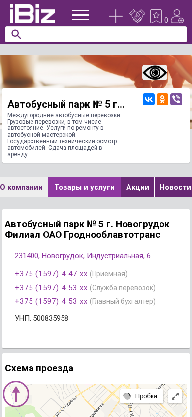 | Название / Заголовок | Автобусный парк № 5 г. Новогрудок Филиал ОАО Гроднооблавтотранс - Междугородние автобусные перевозки. Грузовые перевозки, в том числе автостояние. Услуги по ремонту в автобусной мастерской. Государственный технический осмотр автомобилей. Сдача площадей в аренду.. 231400, Новогрудок, , Индустриальная, 6 |