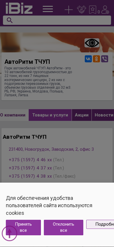 | Название / Заголовок | АвтоРитм ТЧУП - Парк автомобилей ЧТУП АвтоРитм - это 10 автомобилей грузоподъемностью до 22 тонн, из них 7 пищевых изотермических цисцерн, 2 из них с подогревом перевозимых грузов, объемом грузовых отделений до 32 м3. РБ, РФ, Украина, Молдова, Польша, Латвия, Литва.. 231400, Новогрудок, , Заводская, 2, офис 3 |