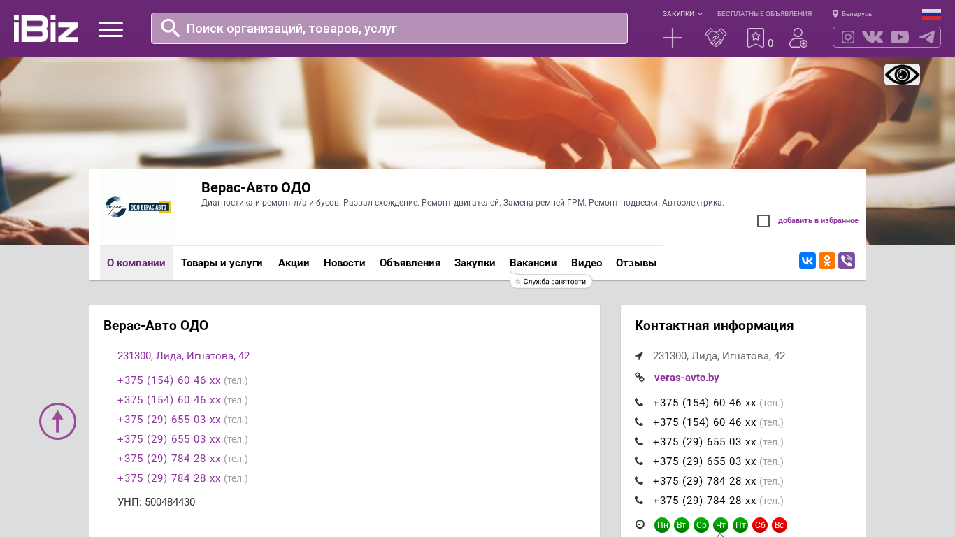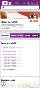| AI-анализ | language: ru The portal veras-avto.ibiz.by is a Belarusian auto repair and diagnostic services company located in Lida, Belarus, with the address Игнатова, 42. The company offers services including diagnostics and repair of л/а and buses, engine repair, replacement of timing chain and camshaft belt, suspension repair, and autoelectric work. Contact information includes multiple phone numbers: +375 (154) 60 46 xx, +375 (154) 60 46 xx, +375 (29) 655 03 xx, +375 (29) 655 03 xx, and +375 (29) 784 28 xx. The business hours |