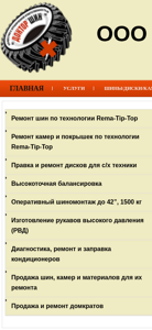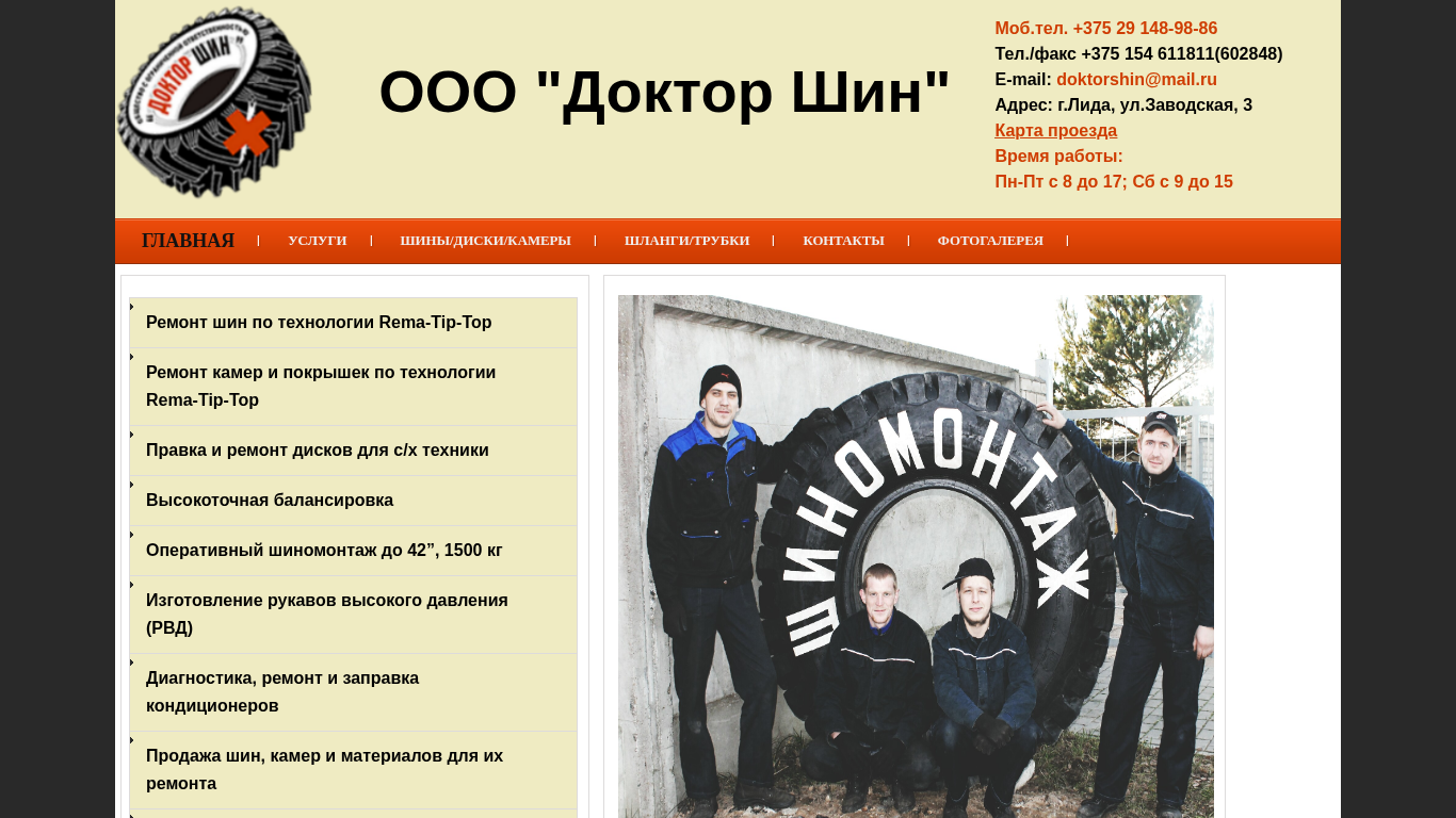 | AI-анализ | This website is the digital presence of OOO "Doctor Shin," a company based in the city of Lida, Belarus, specializing in tire repair and sales, as well as the production and repair of radiator hoses and condensers. The company offers a range of services, including tire balancing, operational tire mounting, and the manufacture of high-pressure hoses. Additionally, Doctor Shin provides diagnostics, repairs, and refills for condensers, and sells tires, repair materials, and equipment. The company's contact information includes a mobile phone number, a landline number, and an email address. The website is accessible from Monday to Friday, 8 a.m. to 5 p.m., and on Saturdays from 9 a.m. to 3 p.m. The main services offered are tire repair and sales, hoses and tub |