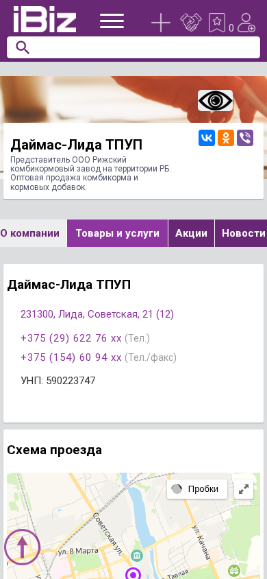| Название / Заголовок | Даймас-Лида ТПУП - Представитель ООО Рижский комбикормовый завод на территории РБ. Оптовая продажа комбикорма и кормовых добавок.. 231300, Лида, , Советская, 21 (12) |