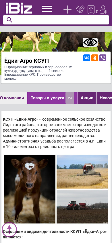 | Название / Заголовок | Ёдки-Агро КСУП - Выращивание зерновых и зернобобовых культур, кукурузы, сахарной свеклы. Выращивание КРС. Производство молока.. 231310, , Ёдки аг., Центральная, 27 |