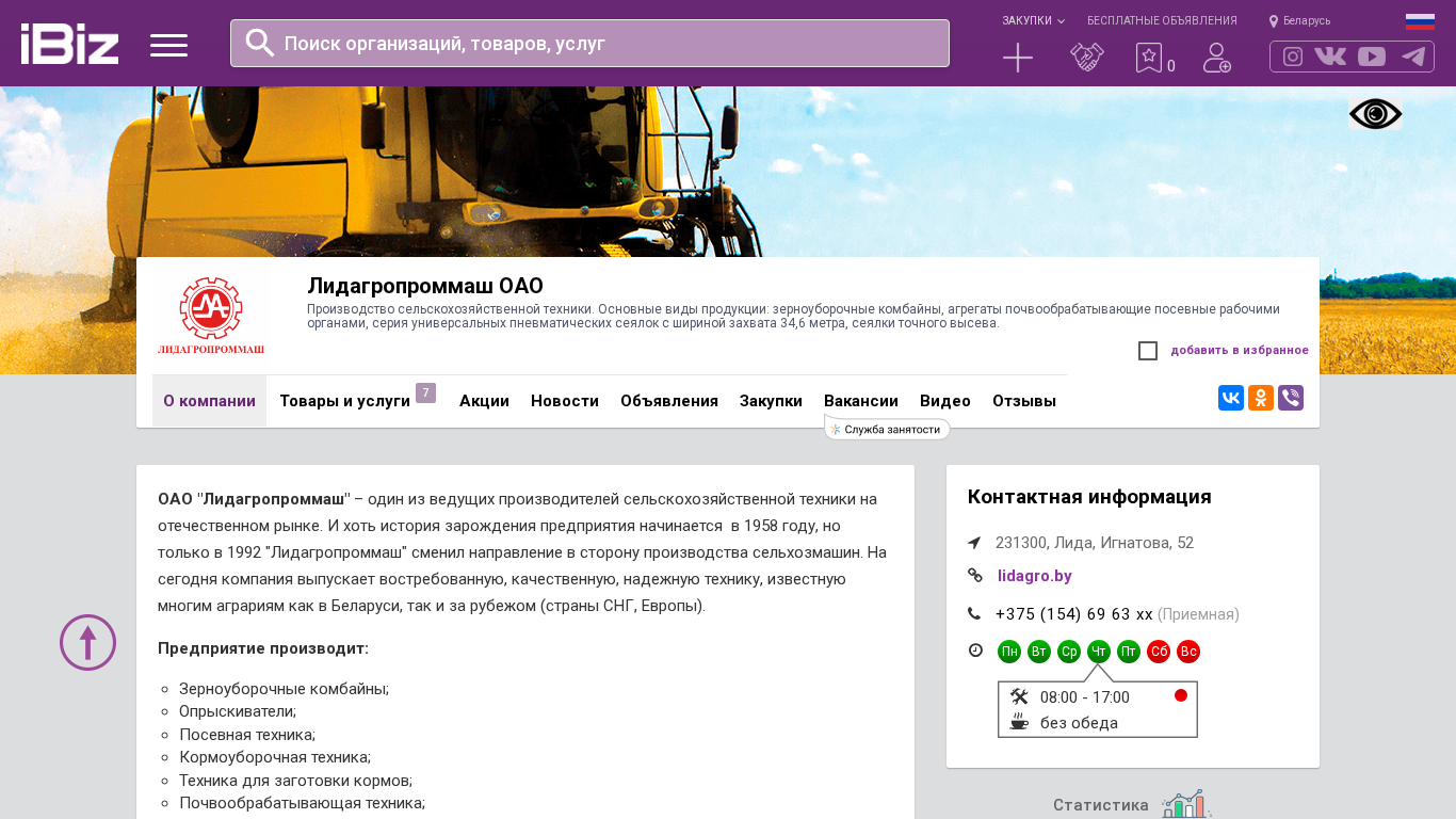 | AI-анализ | The website is for the Belarusian company "Лидагропроммаш ОАО" specializing in the production of agricultural machinery. Its main product categories include harvesting combines, tillage equipment, universal pneumatic seed drills with a 34.6-meter width, and precision seed drills. The company's address is listed as 231300, Лида, , Игнатова, 52. |