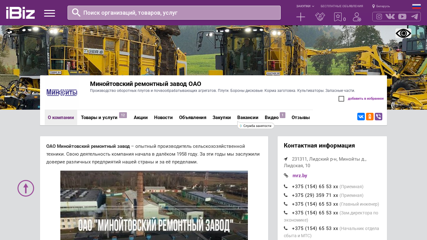 | Название / Заголовок | Минойтовский ремонтный завод ОАО - Производство оборотных плугов и почвообрабатывающих агрегатов. Плуги. Бороны дисковые. Корма заготовка. Культиваторы. Запасные части.. 231311, , Минойты д., Лидская, 10 |