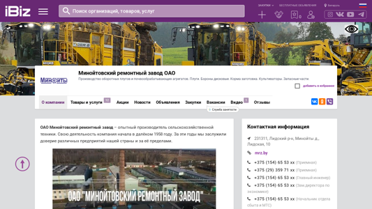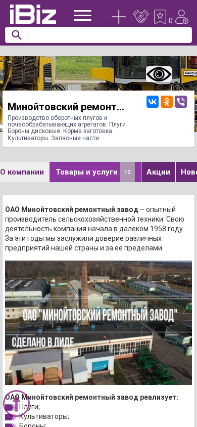 | AI-анализ | url: /minojtowy-remontnyj-zavod-oao/ The website is for the Minoytown Repair Plant OAO, a Belarusian company specializing in the production of turnover plows and soil-processing equipment. Their product range includes plows, disc harrows, corn cutters, cultivators, and spare parts. The company, founded in 1958, has built a strong reputation both domestically and internationally. They offer a range of services including metalworking and shot blasting. Their products are sold in Kazakhstan, Ukraine, Lithuania, and other countries. The website provides a map and contact information. |