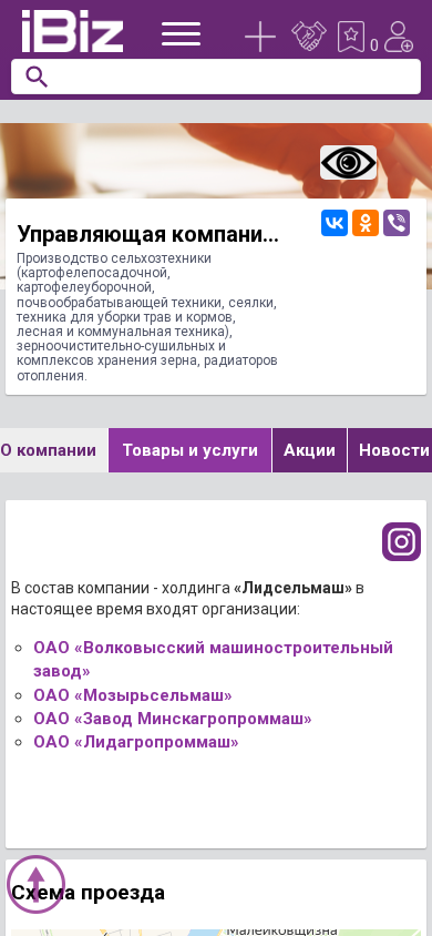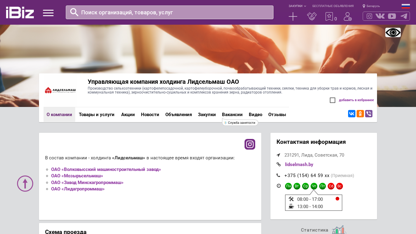 | Название / Заголовок | Управляющая компания холдинга Лидсельмаш ОАО - Производство сельхозтехники (картофелепосадочной, картофелеуборочной, почвообрабатывающей техники, сеялки, техника для уборки трав и кормов, лесная и коммунальная техника), зерноочистительно-сушильных и комплексов хранения зерна, радиаторов отопления.. 231291, Лида, , Советская, 70 |
