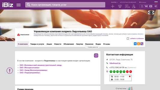 | AI-анализ | The portal is a managing company of the holding "Lidselmash" OAO, which produces agricultural machinery (potato planters, potato harvesters, soil cultivating machinery, seed drills, machinery for harvesting crops and fodder, forestry and municipal equipment), grain cleaning and drying complexes, and radiators for heating. Located in Lida, Belarus, at Sovietskaya 70. The company's contact information and map are provided. Business hours are Monday to Friday from 8:00 to 17:00, with a lunch break from 13:00 to 14:00. Saturdays and Sundays are closed. |