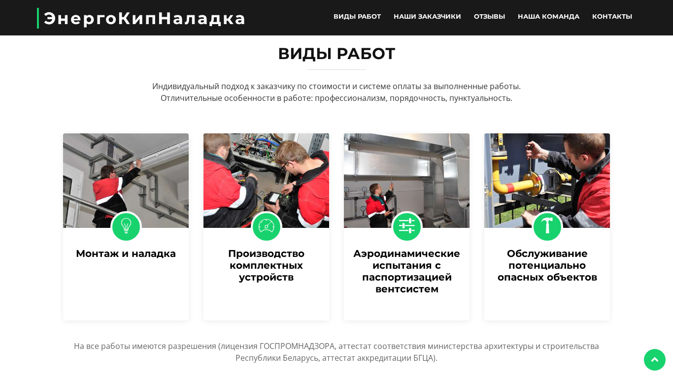 | AI-анализ | The website <http://energolida.by> is titled "ООО ЭнергоКипНаладка - электромонтажные работы" and focuses on providing electromontage and on-site adjustment services. The company offers an individual approach to clients regarding pricing and payment methods for completed work. Notable features of their work include professionalism, orderliness, and punctuality. Services offered include electromontage and production of complete devices, as well as aerodynamic testing and certification of ventilation systems. The company holds various permits, including a license from GOSPROMNADZOR, an attestation from the Ministry of Architecture and Construction of the Republic of Belarus, and an accreditation certificate from BGTSR. Major clients include "Стройвектор," Upravlenie obrazovaniya L |