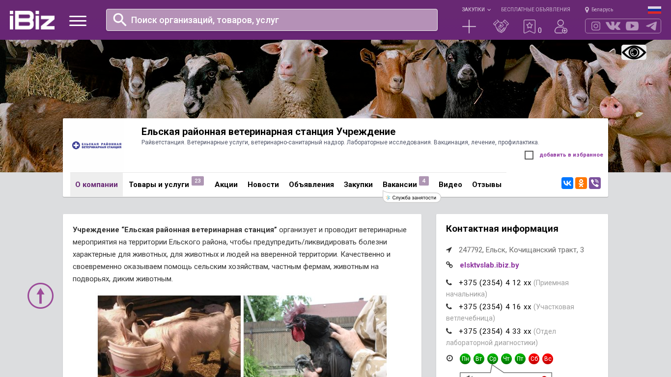 | AI-анализ | url: / The web project Elsktvslab.ibiz.by is dedicated to the Elskaya district veterinary station, an institution named "Rayvetstanitsa," which offers veterinary services, veterinary-sanitary supervision, and laboratory research for animals. The station specializes in vaccination, treatment, and prevention for various animal diseases. The institution's contact information, address, and a map for reaching the location are provided. The website also includes sections for advertisements, vacancies, news, and company information. The Elskaya district veterinary station serves the agricultural community, farms, private households, and wild animals in the area by ensuring veterinary assistance for livestock, domestic animals, and implementing various veterinary, sanitary, and preventive measures. The station also provides paid services to the public, including veterinary certificates, animal castration, diagnostic tests, vaccinations |
