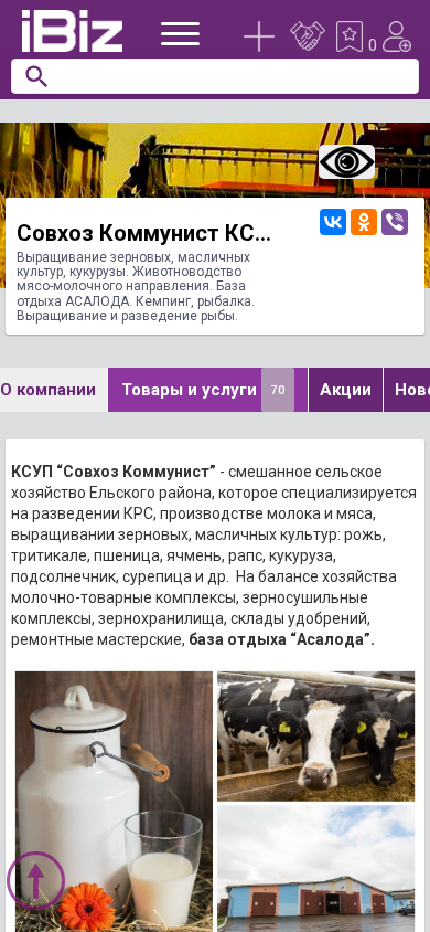 | Название / Заголовок | Совхоз Коммунист КСУП - Выращивание зерновых, масличных культур, кукурузы. Животноводство мясо-молочного направления. База отдыха АСАЛОДА. Кемпинг, рыбалка. Выращивание и разведение рыбы.. 247827, , Заширье д., 50 лет СССР, 32 |