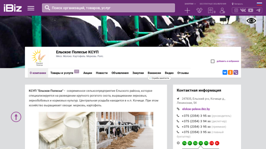 | AI-анализ | --- The website belongs to Ельское Полесье KСУП, a modern agricultural enterprise located in the Yelsky district, specializing in cattle farming and crop cultivation. The company grows grains, legumes, and fodder crops, and offers meat, milk, potatoes, carrots, and rapeseed. The central farmstead is situated in the village of Koчище. The farm generates the majority of its revenue from the livestock industry, while crop production focuses on producing forage for cattle. The company keeps updating its livestock facilities, equipment, and constructs new farms and complexes. It also provides veterinary services and transportation to the local population. The website offers high-quality agricultural produce at reasonable prices and welcomes collaborations. The contact information includes phone numbers for the farm's leader, dispatcher, receptionist, and chief accountant. The farm's opening |