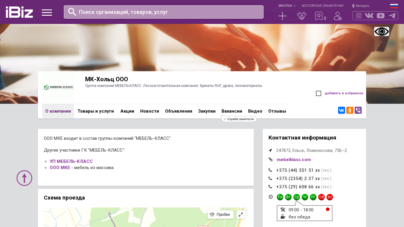 | Название / Заголовок | МК-Хольц ООО - Группа компаний МЕБЕЛЬ-КЛАСС. Лесозаготовительная компания. Брикеты RUF, дрова, пиломатериалы.. 247873, Ельск, , Ломоносова, 73Б–2 |