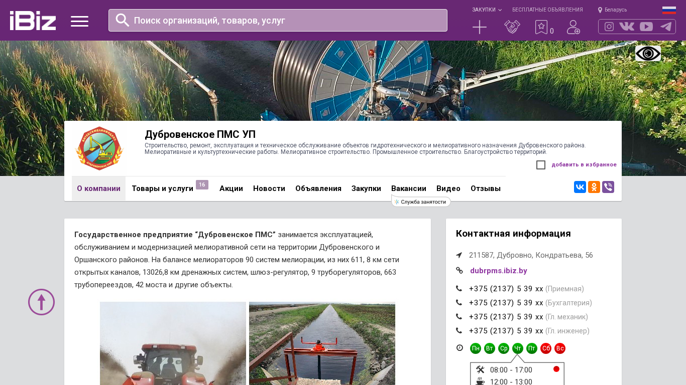 | Название / Заголовок | Дубровенское ПМС УП - Строительство, ремонт, эксплуатация и техническое обслуживание объектов гидротехнического и мелиоративного назначения Дубровенского района. Мелиоративные и культуртехнические работы. Мелиоративное строительство. Промышленное строительство. Благоустройство территорий.. 211587, Дубровно, , Кондратьева, 56 |