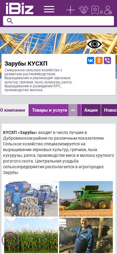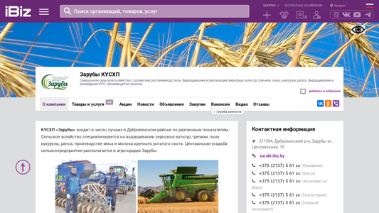 | Название / Заголовок | Зарубы КУСХП - Смешанное сельское хозяйство с развитым растениеводством. Выращивание и реализация зерновых культур, гречихи, льна, кукурузы, рапса. Выращивание и разведение КРС, производство молока.. 211594, , Зарубы аг., Центральная, 15 |