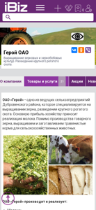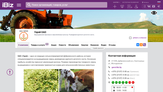 | AI-анализ | This website is for OAO "Hero" - a leading agricultural enterprise in Dubrovensky district of Belarus, specializing in the cultivation of cereals and legumes, as well as breeding of large cattle. The company's main revenue comes from the sale of milk. In addition to the production of market grain, we also cultivate and store fodder crops for farm animals. OAO "Hero" produces and sells: Milk; Beef; Fodder crops for farm animals; Cereals; Legumes. The enterprise consists of livestock and dairy farms, complexes, grain storage facilities, and field brigades. We offer transportation services and veterinary services to the public. We guarantee high quality agricultural products, as evidenced by certificates, diplomas, customer reviews, competitive prices, and favorable cooperation terms! We look forward to your calls! |