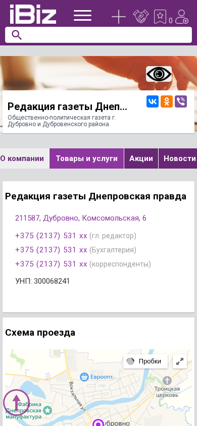 | AI-анализ | --- This online resource is the website of the Dneprovskaya Pravda newspaper office, serving the city of Dubrovno and the Dubrovensky district in Belarus. The site provides information on how to reach the office, contact details, and the address: 211587, Dubrovno, Komsomoslka Street, 6. The main sections of the site include free classifieds, a company profile, and information on products and services related to newspapers and internet publications, as well as various categories such as vacancies, videos, and reviews. The site also features a contact form and a map showing the location of the office. The operating hours are listed as Monday to Friday from 8:00 to 17:00, with a lunch break from 13:00 to 14:00. The site is operated by ООО "А |