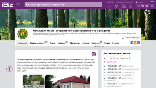 | AI-анализ | --- This website represents the State Forestry Enterprise "Lepelsky Leshoz" in Belarus. The main activities include the preservation and creation of forest funds, as well as the sale of timber products and decorative planting materials. The offered timber products consist of processed wood such as planed boards, beams, and logs. Additionally, the sale includes firewood, fuel chips, and round logs for heating purposes. Decorative planting materials include various species such as juniper and pine. The website includes a map for navigation, contact telephone numbers, and the address of the company. The enterprise operates in the regions of Lepeль, Chaшnik, and Sennensky, covering a total area of approximately 96,000 hectares, with 85,900 hectares covered by forests. Neighboring forestry enterprises include Ushachsky |
