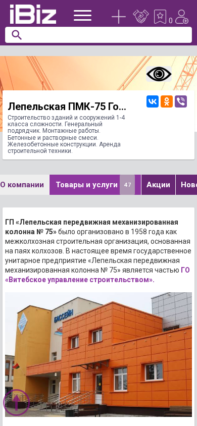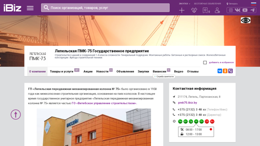 | AI-анализ | This website is for the state enterprise "Lepelskaya PMK-75" in Belarus, which specializes in the construction of buildings and structures of classes 1-4 complexity, acting as a general contractor, performing montage works, producing and selling concrete and mortar mixtures, and renting out construction equipment and real estate. The enterprise was established in 1958 as a cooperative of local collectives and is now part of the State Enterprise "Vitebsk Construction Management". The company offers various construction-related services, including building works, montage works, the production and sale of concrete and mortar mixtures, the production and sale of reinforced concrete structures, and the rental of construction equipment and real estate. The enterprise has participated in the construction of significant local projects, such as a recreational complex with a swimming pool and a kindergarten for 230 children |