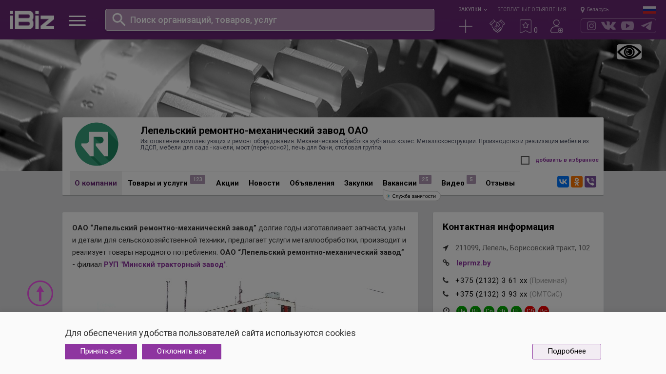 | Название / Заголовок | Лепельский ремонтно-механический завод ОАО - Изготовление комплектующих и ремонт оборудования. Механическая обработка зубчатых колес. Металлоконструкции. Производство и реализация мебели из ЛДСП, мебели для сада - качели, мост (переносной), печь для бани, столовая группа.. 211099, Лепель, , Борисовский тракт, 102 |