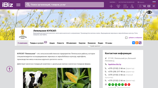 | Название / Заголовок | Лепельское КУПСХП - Выращивание крупного рогатого скота мясо-молочного направления. Производство молока и мяса. Выращивание зерновых и зернобобовых культур. Рапс, кукуруза, картофель.. 211181, , Большой Полсвиж д. |