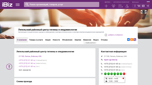 | AI-анализ | This online resource is a website for the Lepeль District Center for Hygiene and Epidemiology, which is responsible for organizing and implementing oversight of sanitary-hygienic and anti-epidemic measures. The website includes information about the organization, its products and services, contacts, and a schedule. The domain is registered in Belarus with the Unified State Register of Enterprises under the code 300246792. The contact information includes several phone numbers and the address 211180, Lepeль, Voikova, 69A. The website is open for visits Monday through Friday from 8:00 AM to 7:45 PM, with a break for lunch from 1:00 PM to 2:00 PM. The website is categorized under 'sanepidstationies' in the Ibiz |