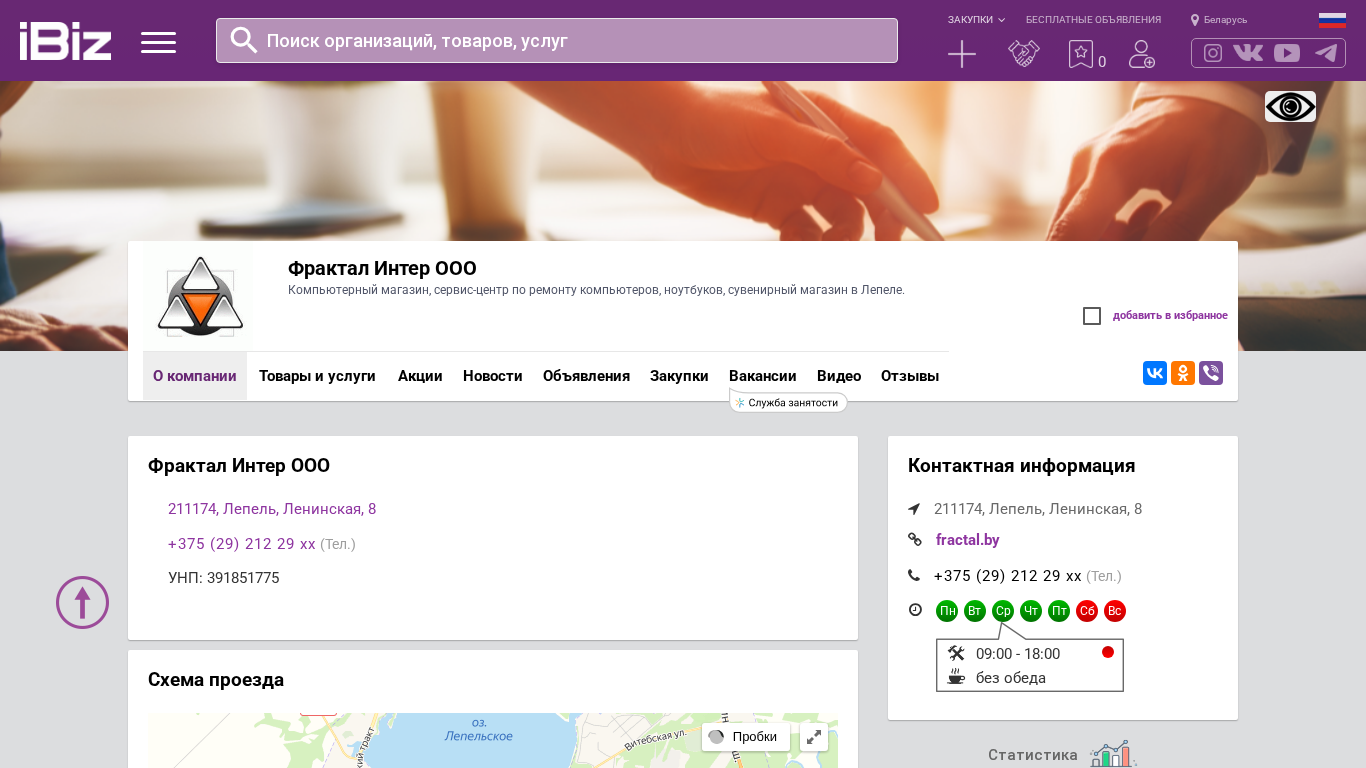 | Название / Заголовок | Фрактал Интер ООО - Компьютерный магазин, сервис-центр по ремонту компьютеров, ноутбуков, сувенирный магазин в Лепеле.. 211174, Лепель, , Ленинская, 8 |