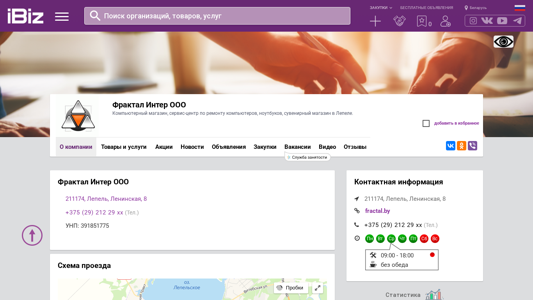 | AI-анализ | The web project "Fractal Inter OOO" is a computer store and service center for the repair of computers and laptops, along with a souvenir shop located in Lepele, Belarus. The address is Ленинская, 8, 211174, Лепель. The company can be contacted at +375 (29) 212 29 xx. Business hours are from 09:00 to 18:00, Monday through Saturday, with Sundays being a day off. The company specializes in the sale of computers and office equipment, as well as the provision of repair services for these items. Additionally, there is a souvenir shop on the premises. The website provides a map for directions, contact information, and business hours. |