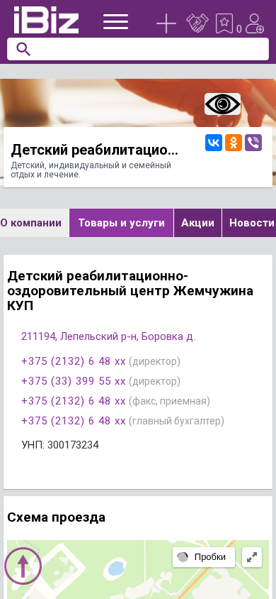 | AI-анализ | language: ru This website is for a children's rehabilitation and health resort center named Жемчужина КУП (Jemchuzhina KUP), located in the village of Боровка, in the Lepeльsky region of Belarus. The website provides information on the center's individual and family recreational and therapeutic services. Contact information, including phone numbers for the director and fax, as well as the address, are listed. The Unified State Register number is 300173234. The website includes sections for company information, products and services, news, announcements, vacancies, videos, reviews on social media platforms, and contact information. Business hours are listed as Monday through Friday, 9:00 AM to 6:00 PM, with no lunch break. The website is in the categories of sanatoriums and |