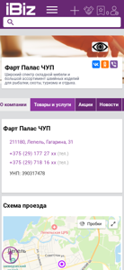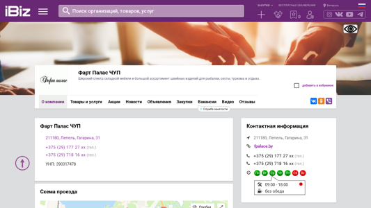 | AI-анализ | This website is for Fart Palas CHUP, a company located in Lepeль, Belarus, with the address on Gaagarina street, number 31. The company offers a wide range of foldable furniture and a large selection of sewing items for fishing, hunting, tourism, and recreation. Contact information for Fart Palas CHUP includes two phone numbers, +375 (29) 177 27 xx and +375 (29) 718 16 xx. The company's UNP number is 390317478. The website provides a map scheme for reaching the location and business hours from Monday to Saturday, 9:00 AM to 6:00 PM, with no lunch break. The company is listed under the categories of "Goods for rest and tourism" |