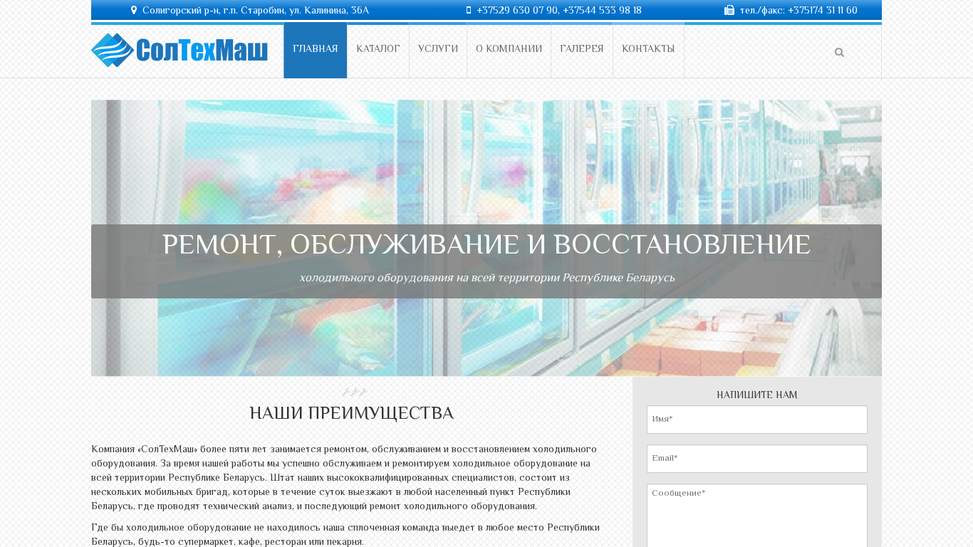 | SEO-описание | Сайт компании СолТехМаш г.п. Старобин. Обслуживаем, ремонтируем и восстанавливаем холодильное оборудование на всей территории Республике Беларусь |