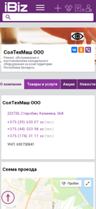 | AI-анализ | The website is for SolTechMash OOO, a Belarusian company offering repair, maintenance, and restoration services for refrigeration equipment throughout the Republic of Belarus. The address and contact information, including three phone numbers, are provided on the page. The company's UNP number is 690750841. The website includes sections for company information, products and services, news, job vacancies, and customer reviews on various social media platforms. The business hours are listed as Monday through Sunday, 9:00 AM to 8:00 PM, with no breaks for lunch. The website is categorized under refrigeration equipment in the Yandex Business Directory. |