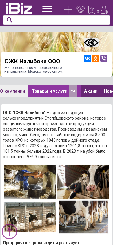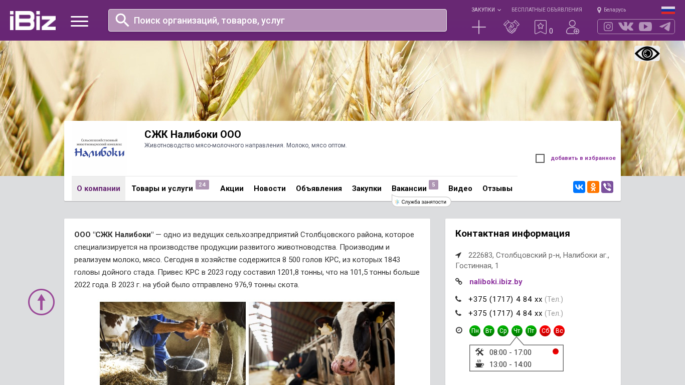 | AI-анализ | The website is for OOO "SJK Naliboki," a livestock farming enterprise focusing on dairy and meat production in Belarus. The company produces and sells milk and meat in bulk. The website provides a scheme for reaching the farm, as well as contact information. The enterprise holds over 8,500 head of livestock, with 1,843 of these being dairy cows. In 2023, livestock production yielded 1,201.8 tons, an increase of 101.5 tons from the previous year. In 2023, 976.9 tons of livestock were processed for meat. The farm consists of three cattle breeding farms, four dairy and beef farms, and a milk processing center for 550 head of dairy cows. The enterprise guarantees high |