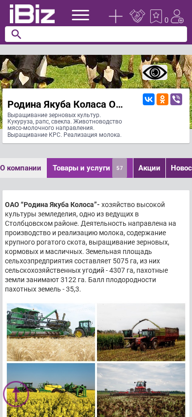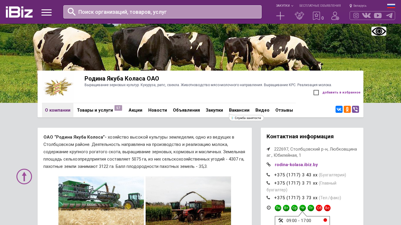 | Название / Заголовок | Родина Якуба Коласа ОАО - Выращивание зерновых культур. Кукуруза, рапс, свекла. Животноводство мясо-молочного направления. Выращивание КРС. Реализация молока.. 222697, , Любковщина аг., Юбилейная, 1 |