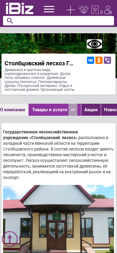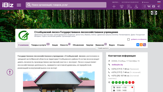 | Название / Заголовок | Столбцовский лесхоз Государственное лесохозяйственное учреждение - Древесина в круглом виде, оцилиндрованная и окоренная. Доска пола, обшивка, плинтус. Древесные гранулы (пеллеты). Пиломатериалы. Дрова. Посадочный материал. Отдых в охотничьем домике. Организация охоты.. 222666, Столбцы, , 17 Сентября, 15 |