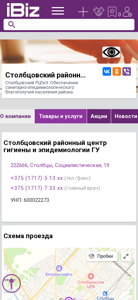 | AI-анализ | The website is a regional health and epidemiology center, "Столбцовский районный центр гигиены и эпидемиологии ГУ - Столбцовский РЦГиЭ," located in the city of Столбцы, Belarus. The center is dedicated to ensuring the sanitary-epidemiological wellbeing of the local population. Contact information, including phone numbers and an address, are provided on the website. The website includes sections for company information, products and services, news, announcements, vacancies, videos, and reviews. The center's hours of operation are listed as Monday through Saturday, from 8:00 a.m. to 8:00 p.m., with a lunch break from 12:30 p.m. to 1:00 p.m. The contact information includes a |