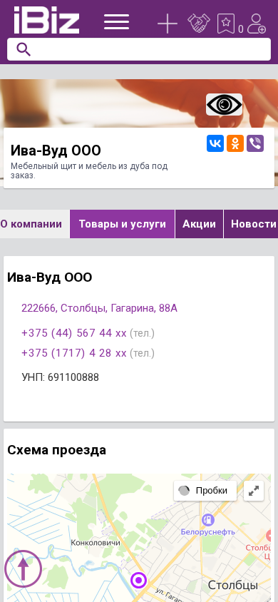 | AI-анализ | The website is for a company named Ива-Вуд ООО, located in Sтолбцы, Minsk region, at the address Гагарина, 88A. The company specializes in custom-made wooden shields and furniture made of oak. The website provides contact information, including two phone numbers and the company's UNP (state registration number). Business hours are listed as Monday to Friday from 9:00 to 18:00, with no breaks for lunch. The site also includes a map for directions and links to various company categories on ibiz.by, such as 'Mobility and Services', 'Business Services for Businesses', and 'Building and Repair'. The domain is iva-wood.ibiz.by. |