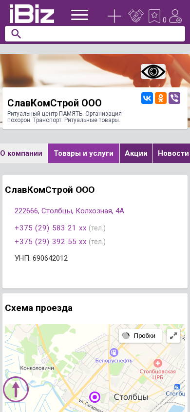 | Название / Заголовок | СлавКомСтрой ООО - Ритуальный центр ПАМЯТЬ. Организация похорон. Транспорт. Ритуальные товары.. 222666, Столбцы, , Колхозная, 4А |